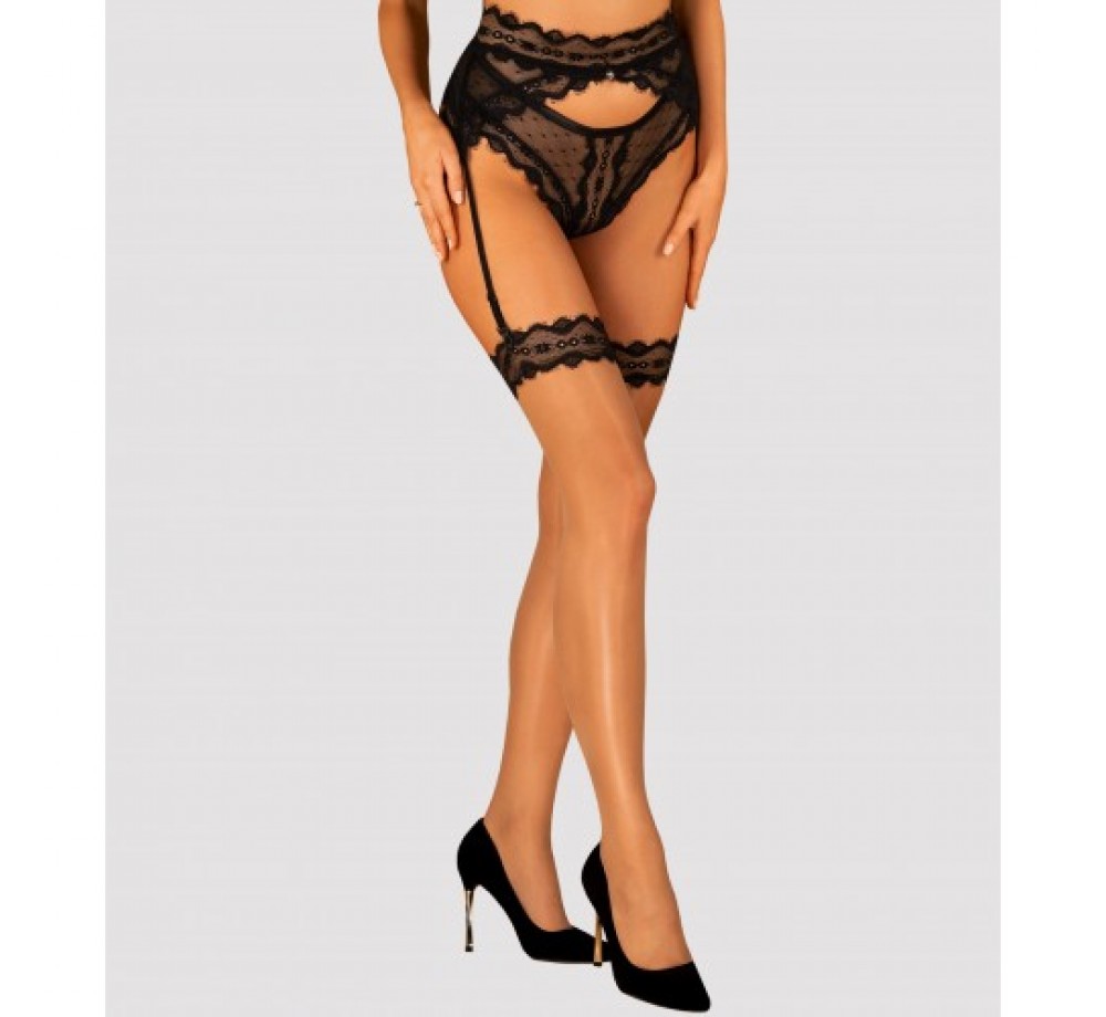 Детали: обнаженные чулки Marrbel; черная кружевная отделка в виде подвязки – соблазнительный и элегантный элемент; нежный, бежевый материал – подчеркивает красоту ног; приятные на ощупь эластичные материалы.