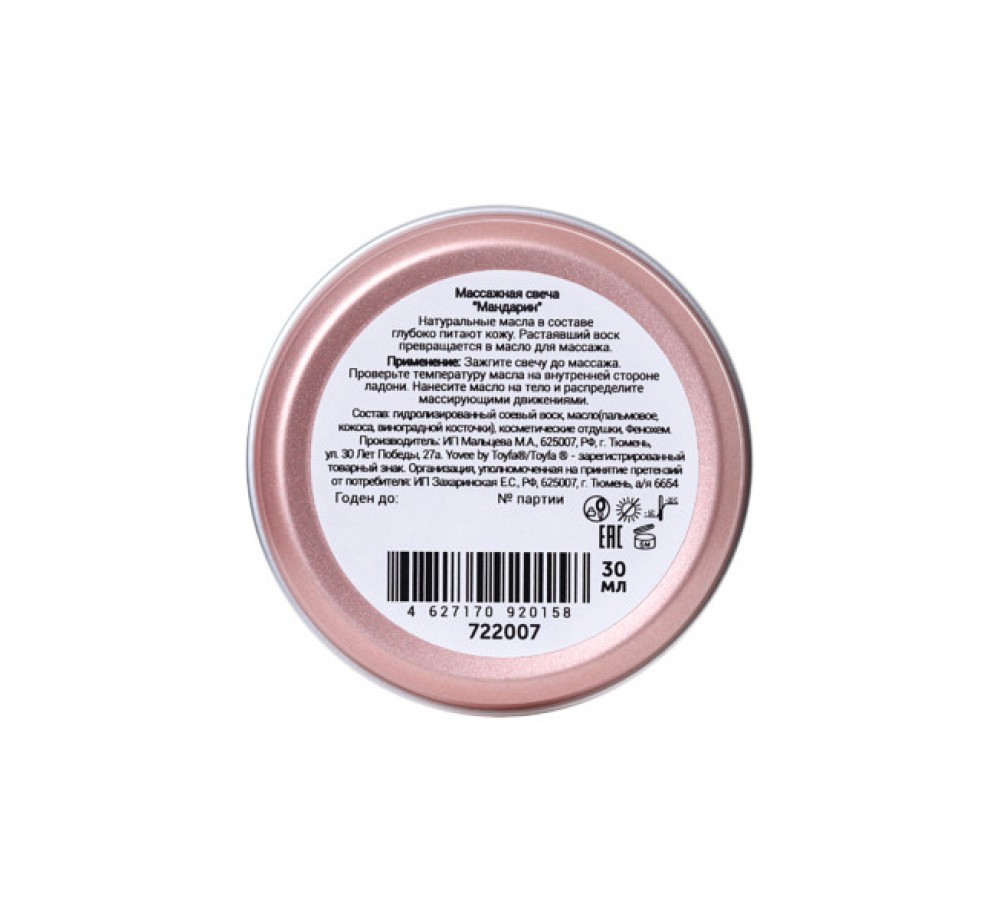МАССАЖНАЯ СВЕЧА YOVEE BY TOYFA «АРОМАТНЫЙ МАССАЖ», С АРОМАТОМ МАНДАРИНА, 30 МЛ