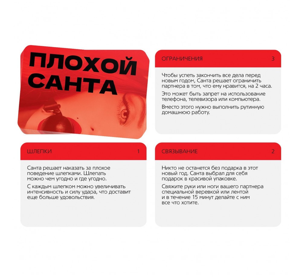 Каждый год Санта дарит подарки и не получает вознаграждения за свои труды. В этот раз он решил потребовать свою порцию удовольствия! Выберите, кто будет играть роль Санты и наказывать за плохое поведение. Вытягивайте карты из колоды в любом порядке и получайте наслаждение от страстных наказаний!